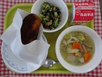 11月の美郷の日給食の日です。今日は西郷町で育てられたじとっこを使った「かきたま汁 と、南郷町で作られた焼き肉のタレと美郷町で作られたしいたけを使った「バーベキューソース炒め」それから秋と言えばさつまいも!さつまいもを使ってさつまいもご飯を炊きました。味付けはシンプルにお酒とお塩だけで炊きあがったご飯にさっと黒ゴマをまぶしました。すべて素材の味を生かした美味しい給食が出来ました。今日の美郷は朝から冷たい雨が降り秋を通り越して冬の気温です。寒さを吹き飛ばすような美味しい給食を子供たちは今日も残さず食べてくれるでしょう。