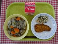 今日は美郷の日給食です。美郷町で作られた食べ物をたくさん使った「秋野菜の煮物」です。美郷町で作られたしいたけ、西郷で育てられたじとっこと栗を使いました。また、和え物には、秋が旬の柿を使った「柿なます」を作りました。秋に一番おいしく食べられる旬の食べ物をたくさん使った美郷の日のメニューです。急に寒くなったので体調管理に気を付けて沢山食べてほしいと願っています。