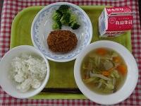 麦ご飯 春野菜のスープ 肉じゃがコロッケ ブロッコリー 牛乳