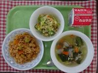 チキンライス マカロニスープ ツナと大豆のサラダ 牛乳