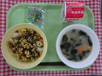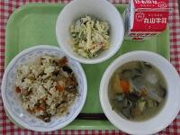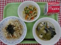 かしわ飯 なすのみそ汁 マカロニサラダ 牛乳