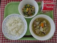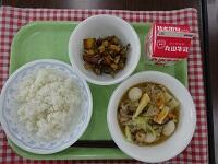麦ご飯 根菜ごまキムチ汁 韓国風宮中トッポギ 牛乳