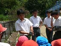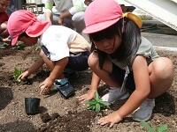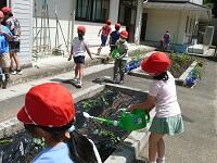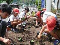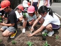 上級生が下級生に苗植えの仕方を優しく教えていました。それぞれの場所に上手に苗を植え、水をたっぷりとあげた子どもたちです。