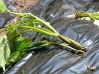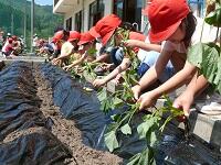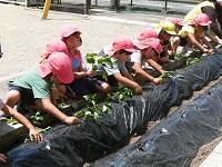 先生方がつくった畝に、1本1本丁寧につるを植えていった子どもたちです。「大きくなってね。」と言いながらじょうろでたっぷり水をやりました。