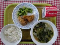 麦ご飯 ワンタンスープ 鶏の唐揚げ そえ野菜 牛乳