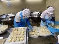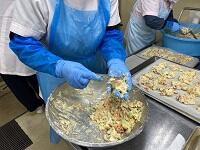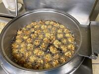 今日は、8年生のリクエスト献立でした!鶏天ご飯と並んで、根強い人気の「お好み揚げ」が、ダントツの1位でした。「お好み揚げ」は、一つ一つ生地を丸めてフライヤーに入れていきます。前期ブロックは1人1個ずつ、後期ブロックは1人2個ずつなので、全部で230個ほど作ります。いかに手際よく、きれいに、美味しく作るか、調理員さんたちが研究してくださり、色んな工夫をしています。作っている様子の写真を撮ったのでいくつか紹介したいと思います。今月の食育だよりに、レシピを載せているので、ぜひご家庭でも作ってみてくださいね!