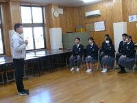 運動場に集合後、役場の危機管理担当の方に火災についての話をしていただきました。火災が起きないように日頃から気を付けるべきこと、もし火災が起きた場合の行動について知ることができました。