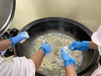 今日のお汁は、かぼちゃや大根、大根葉など野菜たっぷりの「だんご汁」でした。だんごは、やわみ(もち粉と上新粉をブレンドしたもの)と小麦粉を合わせ、つなぎに豆腐を使って作りました。豆腐を使うことでモチモチ感が増して、とっても美味しいだんご汁ができました。お汁にだんごを入れる時は、スプーンを使います。みんなに行き渡るように、小さめのだんごをたくさん作ってもらいました!