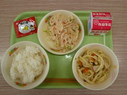 麦ごはん ふりかけ 牛乳 煮込みうどん れんこんサラダ