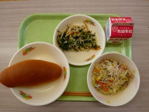 マヨネーズパン 牛乳 チンゲン菜のスープ 魚のバーベキューソース和え