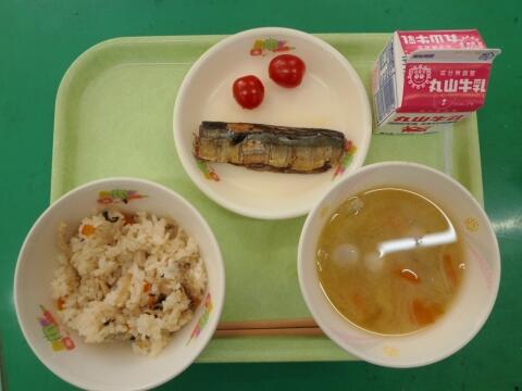 るり子さんのきのこごはん 牛乳 おいものみそ汁 さんまの塩焼き ミニトマト