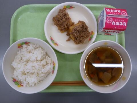 麦ごはん 牛乳 根菜汁 揚げ豆腐の肉みそがけ