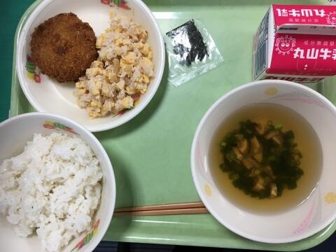 10/4 麦ご飯 牛乳 豆腐の味噌汁 手作りコロッケ 添えキャベツ