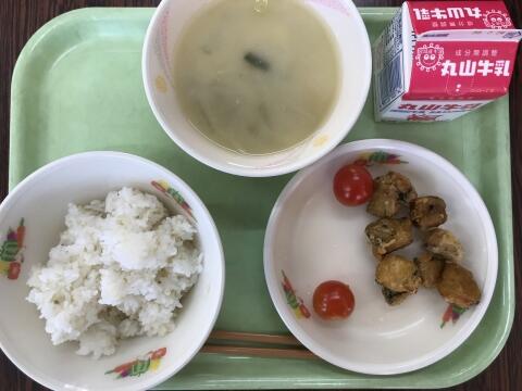 麦ごはん 牛乳 新玉ねぎのみそ汁 じとっこのから揚げ ゆずドレッシングサラダ