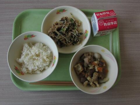 麦ごはん 牛乳 魚そうめん汁 ごぼうと豚肉のごま風味炒め