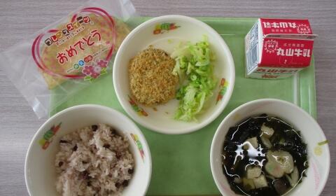 赤飯 牛乳 花ふのすまし汁 さばメンチカツ 添えキャベツ お祝いデザート