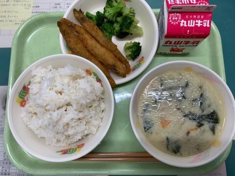 6/3 わかめご飯 牛乳 ジャガイモの味噌煮 ししゃもフライ たたききゅうり