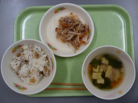 6/4 麦ご飯 牛乳 高菜豆腐と昆布の炒り煮 かみかみごぼうサラダ