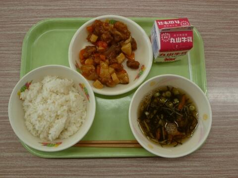 麦ごはん 牛乳 もずく汁 酢豚 ★ラッキーにんじんの日★