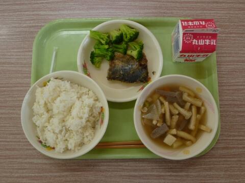 10/1 麦ご飯 牛乳 さつまいもの味噌汁 サバの塩焼き ほうれん草のお浸し 梨