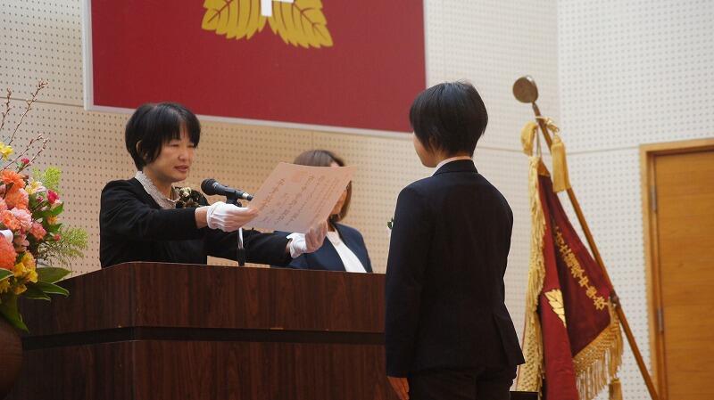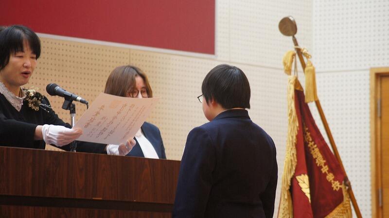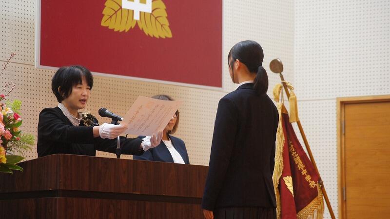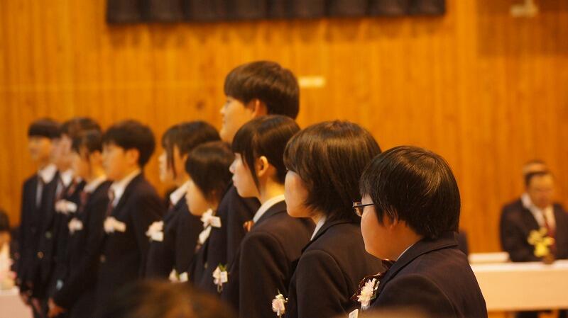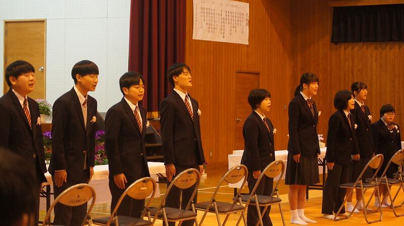 まず、卒業生一人一人に、校長より卒業証書を手渡しました。校長の式辞、在校生代表生徒が送辞を述べたあと、卒業生代表生徒が答辞を述べました。答辞では、3年間の思い出と故郷への思い、そしてこれからの力強いメッセージを伝えてくれました。いつも前を向いて、11名で協力し合い、後輩たちを引っ張りながら、学校生活に取り組む姿は大変立派でした。笑顔で挨拶ができ、他者への思いやりにあふれ、明るい学校生活を送った3年生11名の生徒が、清々しい表情で本校を巣立っていきました。
