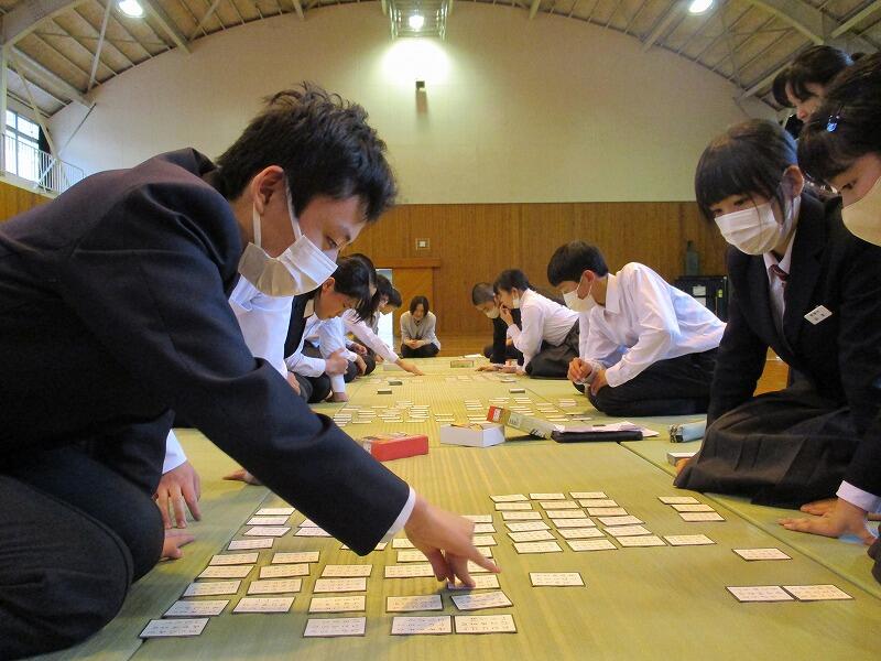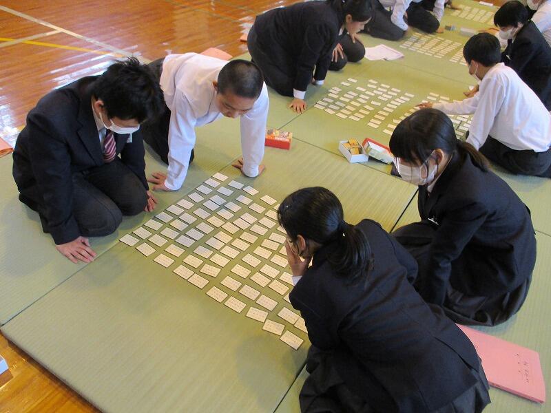 本日の5校時、1、2年生が体育館で百人一首大会をしました。国語科の授業で百人一首に親しみこともありましたが、広いところで競い合うのは初めてでした。生徒たちは、楽しみながら日本の伝統文化のよさを味わっていました。