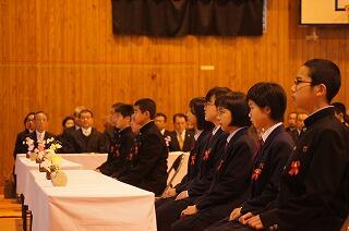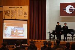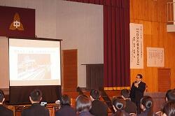 午後からは、立式式が行われました。式では、2年生のこれまでの14年間の人生を振り返るということで、各年の主な出来事や流行語などを交えた発表がありました。その後は、各自が色紙に書いた座右の銘を披露し、決意表明を行いました。どの決意表明も、これまでの自分自身を見つめ直し、今後に向けてどう生きていかないといけないのか、素直な言葉で語られました。大変頼もしく感じた瞬間でした。また、式終了後に記念講演が行われました。「自分の将来を考える」という演題で行われた講演会では、固定観念を打破すること、小さな事をコツコツとやっていくことで大きな事ができるようになること、できない原因はなぜなのかを考えること、などが話されました。本校の立志式は2年生だけではなく、1・3年生も参加しますので、全校生徒が、将来の生き方について考えを深めることができたよい機会になったことと思います。