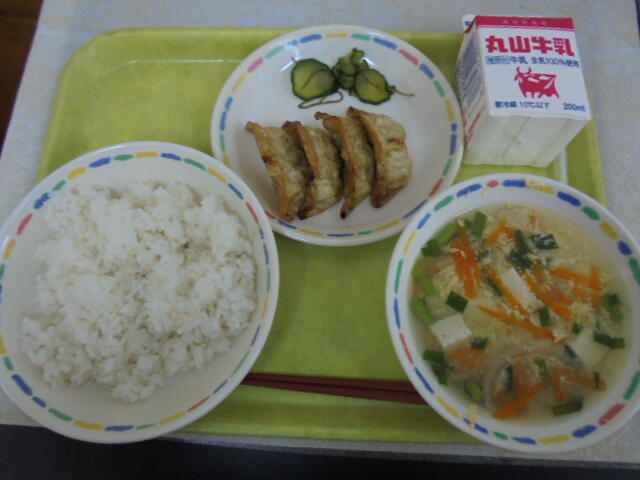 給食黒板を見ながら「やった!揚げ餃子だ!」と、嬉しそうにしている生徒がいた、今日の給食です(*^_^*)