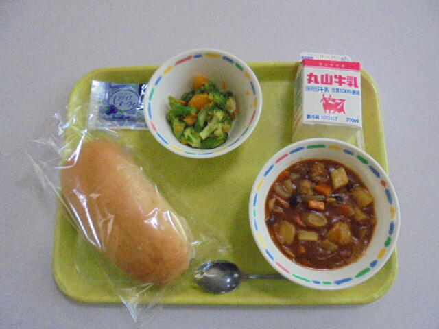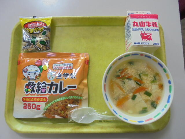 それに関連づけて、今日の給食では防災教育の一貫として備蓄していた「救給カレー」を出しました。