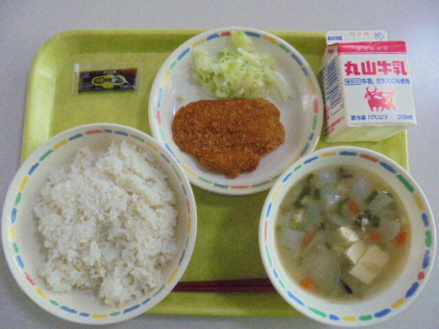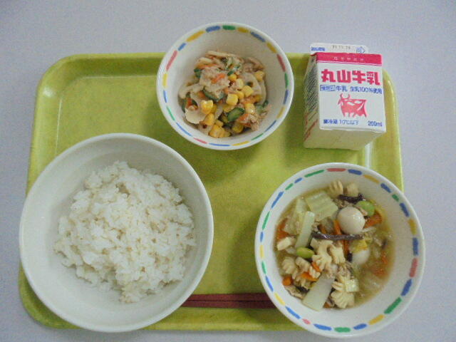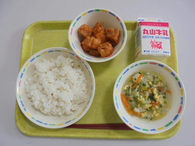 給食黒板を見ながら「やった!揚げ餃子だ!」と、嬉しそうにしている生徒がいた、今日の給食です(*^_^*)