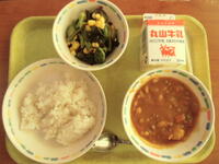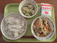 ひき肉と豆のカレーには、ひよこ豆を使いました。ひよこ豆を含む豆類には、体の筋肉や血を作ったり、体を丈夫にするたんぱく質や、お腹の中をきれいにする働きの食物繊維を多く含んでいます。給食でも豆類をよく使っています。