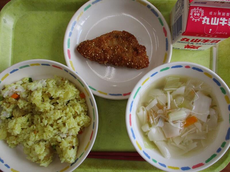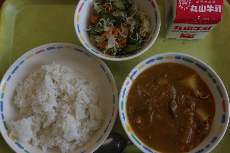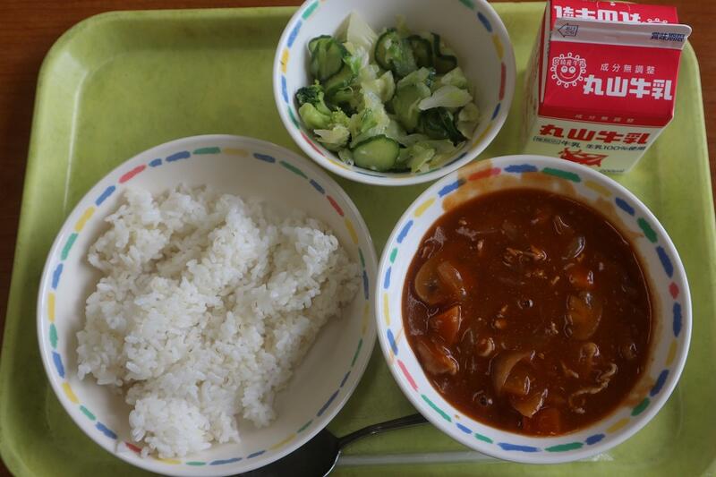 給食のカレーは人気メニューの一つです。大きな釜(鍋)でじっくり煮ることで、とてもおいしく仕上がります。今日は栄養価を高めるためにも、「豚レバー」を細かくしたものも加えています。気づきましたか?