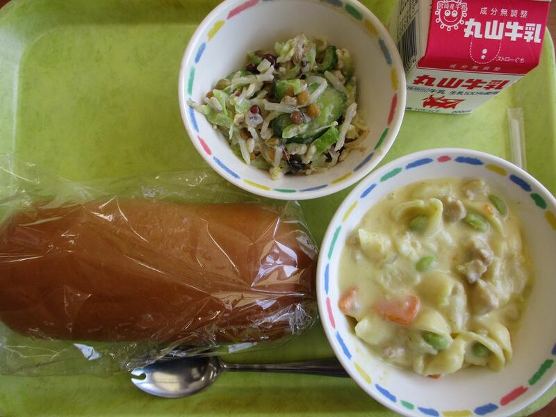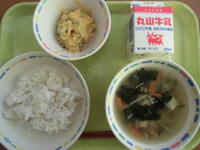 ひき肉と豆のカレーには、ひよこ豆を使いました。ひよこ豆を含む豆類には、体の筋肉や血を作ったり、体を丈夫にするたんぱく質や、お腹の中をきれいにする働きの食物繊維を多く含んでいます。給食でも豆類をよく使っています。