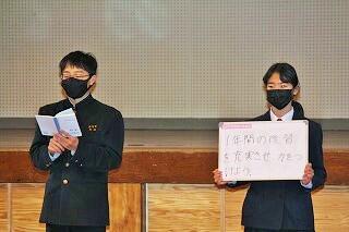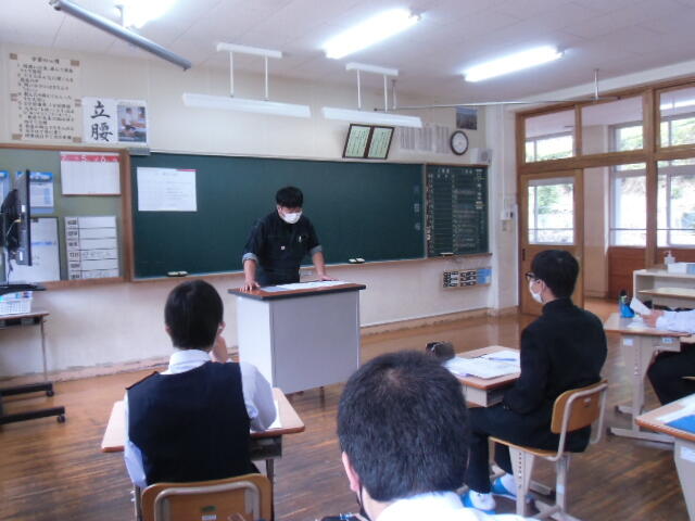 15歳を人生の節目として、改めて目標を立てる取組です。式では2年生一人一人が短い言葉をもとに、決意表明を行いました。また、式後は、諸塚村出身で、デザイナーとして活躍されている甲斐昭兵さんによる講演も行われ、後輩へのエールも贈られました。今後、自分の掲げたスローガンをどのように実践していくか、楽しみに見守りたいと思います。