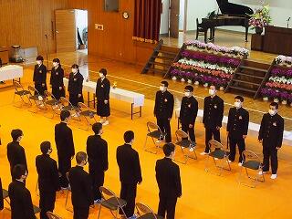 3月16日(水)は、諸塚中学校第75回卒業式でした。天気にも恵まれ、最高の卒業式日よりでした。卒業生と在校生の絆の深さ、これまで育ててくれた親への感謝、見守っていただいた地域の皆様への感謝、厳しくも温かくご指導いただいた先生方への感謝が溢れる涙涙の卒業式でした。9名の卒業生の皆さん、自分の夢実現に向けて、大きく羽ばたいてください。いつまでも応援しています。卒業おめでとう。いってらっしゃい!