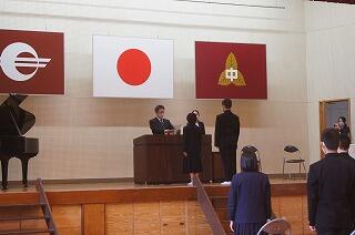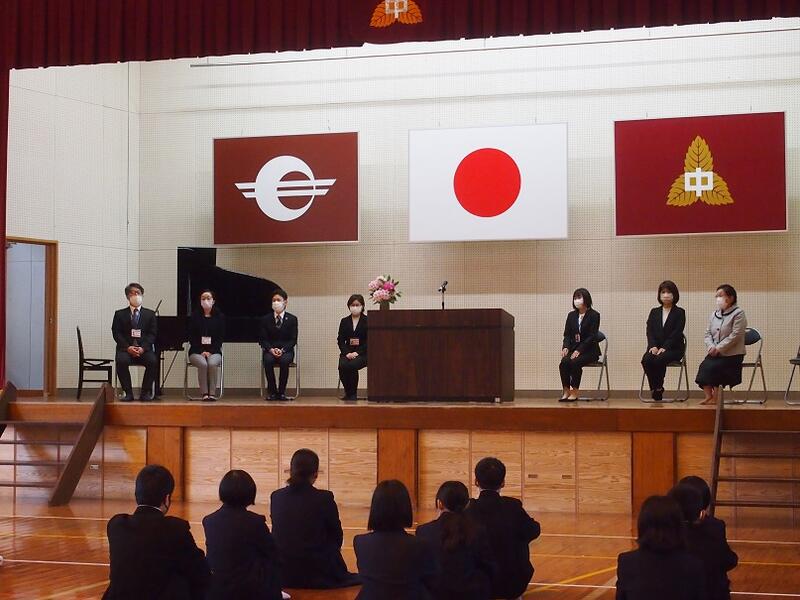 本年度は、男子6名、女子3名、9名の新入生が本校に入学しました。皆、当初は緊張の様子でしたが、記名点呼では、しっかりとした返事が返ってきました。新入生代表として、奈須朱莉さんが、「まわりの友人や先輩方と、切磋琢磨しながら中学校生活を送りたい。」という力強い誓いを述べました。新入生のこれからの活躍が期待されます。