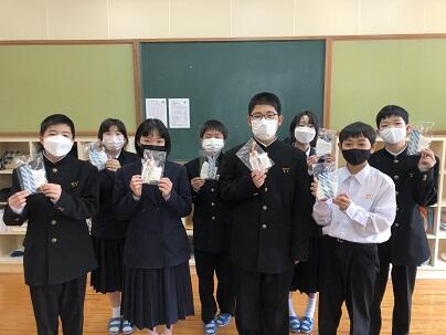 婦人連絡協議会の皆様から、卒業する3年生に手作りのマスクと栞をいただきました。婦人連絡協議会の皆様いつもありがとうございます。3年生は、この春大好きな諸塚を離れますが、このマスクを着用し体調管理に気を付けながら高校生活をがんばります。大切に使わせていただきます。