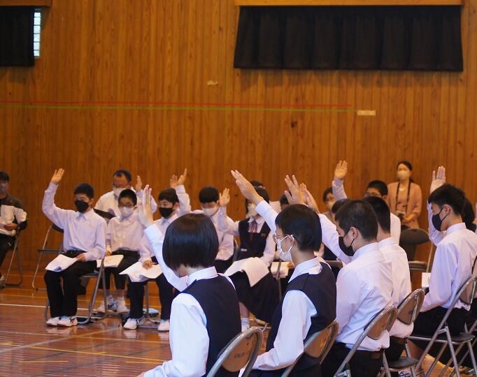 5月30日(月)午後に、生徒総会を実施しました。年に一度とということもあり、生徒会の報告の後、諸塚中学校を更に発展させるための手立てについて、熱心な議論が交わされました。他学年との交流行事や、あいさつ運動の充実等が決定事項となりました。生徒自身の考え方、行動で、更により良い諸塚中学校になる事を期待しています。