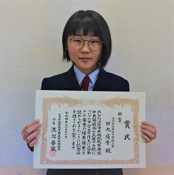 先月になりますが、税務署が主催して毎年実施している中学生の「税についての作文」において、本校3年生の田丸遙音さんの作品が、宮崎県租税教育推進協議会銅賞を受賞しました。
