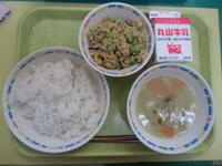 最初の給食は「親子丼、フルーツ杏仁」です。