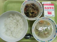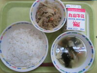 今日は諸塚学校給食の日です。牛丼に使っている玉ねぎ、青ピーマン、しいたけ、糸こんにゃくは諸塚村内で生産・製造されました。