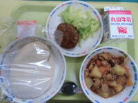 救給カレー、牛乳、お野菜つみれ汁、とろけるプリン