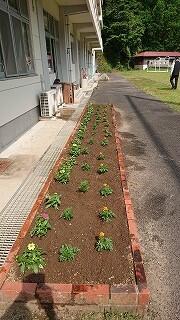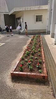 ふれあいの時間に、フラワースマイリー活動を行いました。1週間前、花壇やプランターの下準備をしました。先日は担当の先生が門川高校まで花を取りに行っていただきました。感謝しております。本日いよいよ各学級の花壇やプランターに植えました。「麦藁の帽子が揺れたマリーゴールドに似てる♪」と歌いながらマリーゴールドを植えていました。スマイルになるひとときでした。花があると景色が変わりますね。これから夏に向けて、強く美しく咲き誇るよう、お世話をしていきましょう。