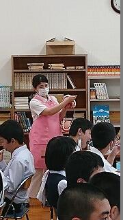 6月に入りました。保体委員会の6月の活動目標は「むし歯予防に努めよう」です。本日、6時間目に、太田歯科の歯科衛生士さんによるブラッシング指導をしていただきました。一人一人歯ブラシ、コップ、手鏡、タオル、牛乳パックを手元に準備して、ピンク色に染め出しした自分の歯を、指導していただいたとおりに、かなり時間をかけて磨きました。皆さん、鏡を見ながら丁寧に磨き上げていました。指導していただいたことを忘れずに毎日続けてほしいですね。