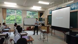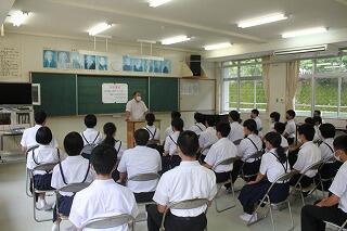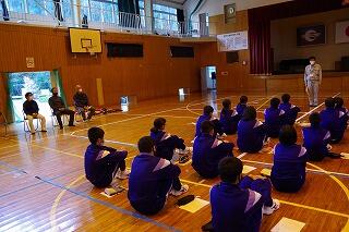 山本先生は、母校の分校でソフトテニスを3か月ほどやりましたが、その後1人で陸上部員として練習に励んだそうです。本校の陸上のチームの一員となり、九州大会、全国大会を目指しました。最後の大会は、チームメイトの支えで入賞したそうです。最後に、「チームメイトを信じてがんばってほしい。」と話されました。