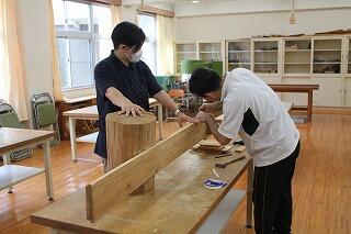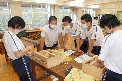 技術室から、いつもより忙しく金槌の音が響いてくるので見学に行ったら、本棚製作の最終時間でした。サポートする姿も見られました。最後には全員完成しました。いい作品ができましたね。