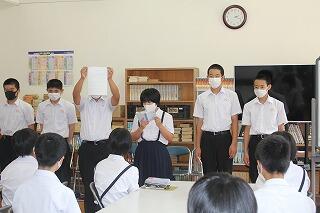 ふれあいタイムで、中学校総合体育大会の選手推戴式を行いました。初めに校長の激励のことばがあり、そのあと各部のキャプテンから大会に向けての抱負が語られました。どの部も「これまでの練習の成果を発揮できるようがんばります。」や「指導していただいた顧問の先生や指導者の方に感謝して大会に臨みます。」と立派に力強く語りました。