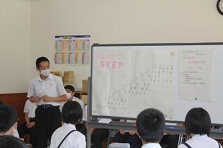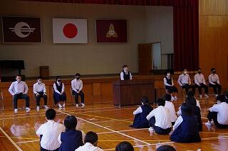 その後、校長から「今日は心のスイッチを入れる日。」また、ラグビーの五郎丸選手の話を紹介し、「未来を変えるために今を変えよう。今何をすべき考えて行動しよう。自分の役割は何なのかを考えて行動しよう。」と話がありました。