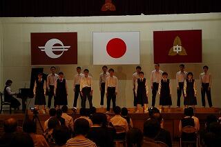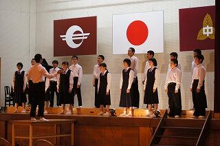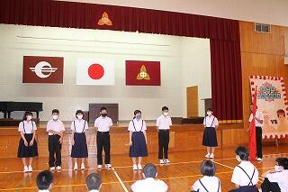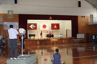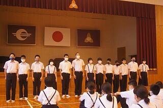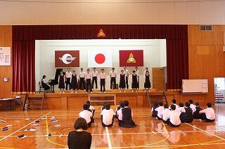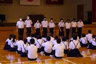 校長の話の後、西田慎之介さん指揮、甲斐花和さん伴奏で、校歌を元気に歌いました。