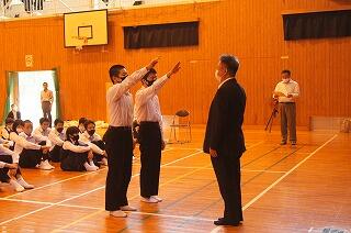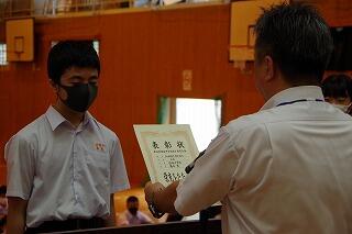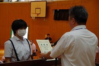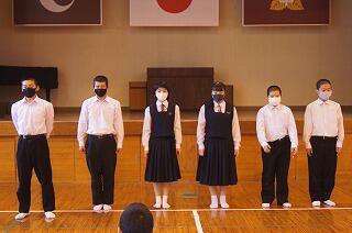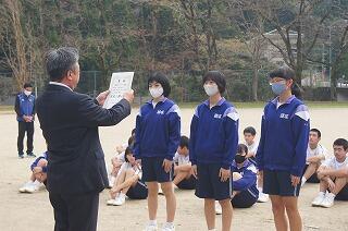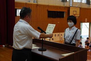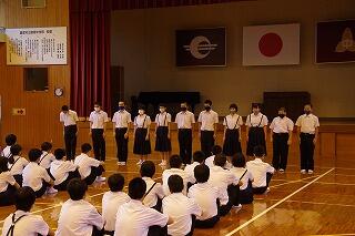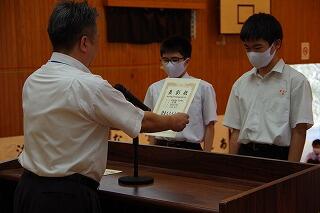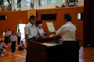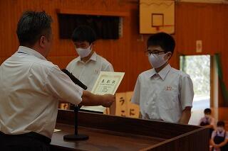 それから、東臼杵地区中学校総合体育大会の剣道部と卓球部の表彰を行いました。栄光をたたえました。よくがんばりました。おめでとう。